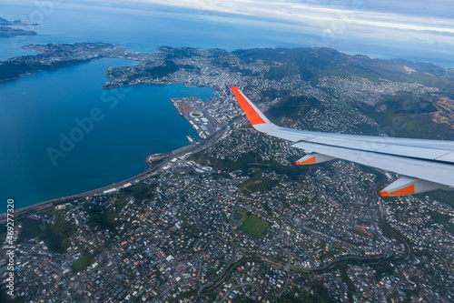 ニュージーランド 飛行機の窓から望むウェリントンの街並みとクック海峡