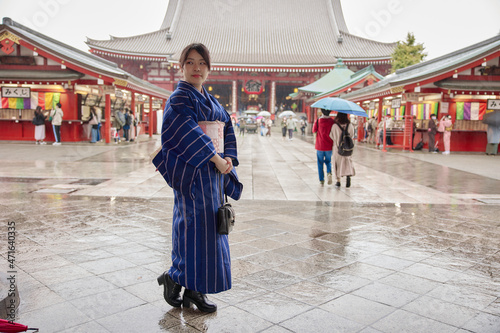 浅草の浅草寺の前に立つ着物姿の日本人女性
