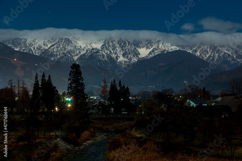 晩秋の白馬村大出公園から月光に照らされた北アルプス