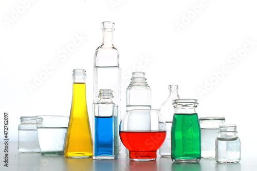 色の付いた水が入った瓶やコップ