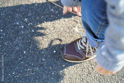 靴紐を結ぶ女性
