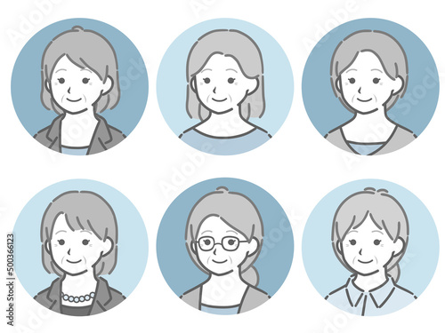 高齢女性の斜め向き丸アイコンセット