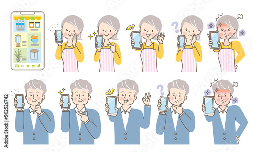 スマホの画面を見せるシニアの女性と男性の表情セット