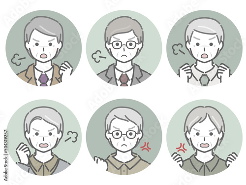 怒る高齢男性の丸アイコンセット