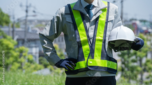 安全ベストを着た作業服姿の男性|建設業・警備員・ガードマン イメージ