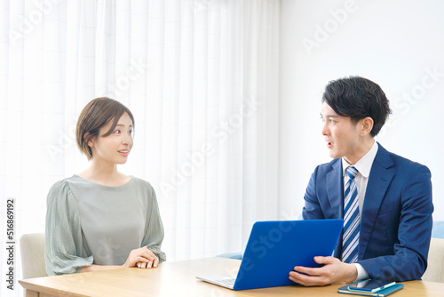 リビングでクライアントと話すセールスマン
