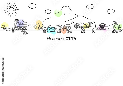 手書きの大分県の街並みと人々のシンプル線画