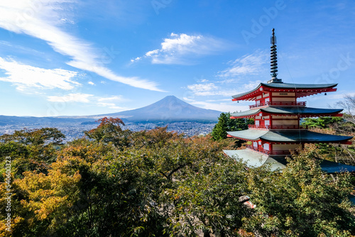 山梨県富士吉田市新倉山からの五重塔と富士山