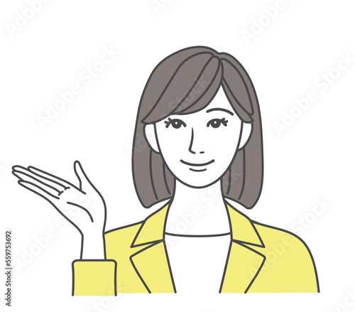 笑顔で案内するスーツ姿の女性 黄色