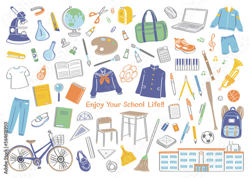 学校生活の文房具や道具のイラストセット(中学校・高校)