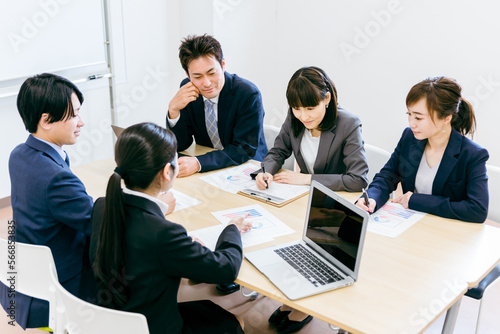 会社・オフィス・会議室で顧客と会議・打ち合わせ・ミーティングするスーツ姿の男女(ビジネス・営業)
