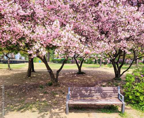 분홍 벚꽃나무 아래 공원 벤치 의자 (올림픽공원)