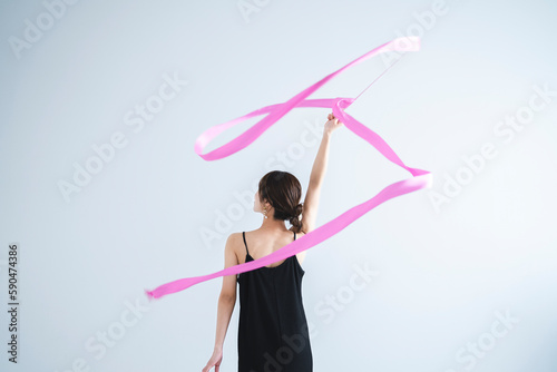 ピンクのリボンを使う女性