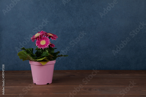 ガーベラの花 木のテーブル 青い背景