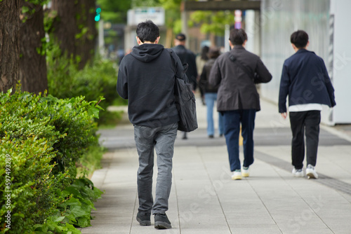通勤時間の街で歩く若者たちの姿