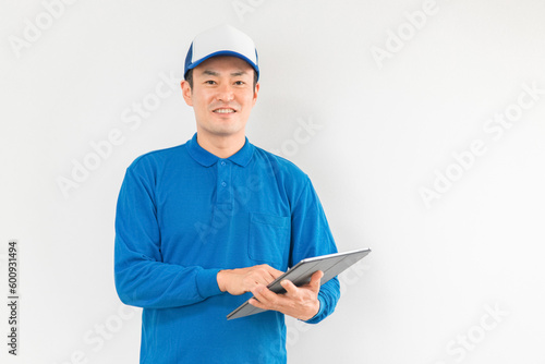 パソコンを持つ引越し業者・配達員の男性(引越し・配達・軽貨物ドライバー・宅配・配達員・宅急便)
