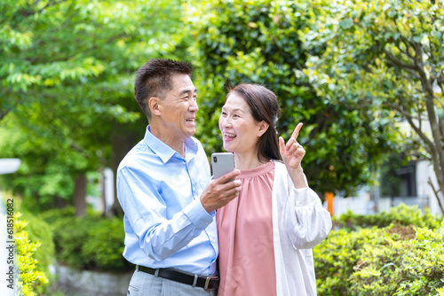 携帯を見る夫婦