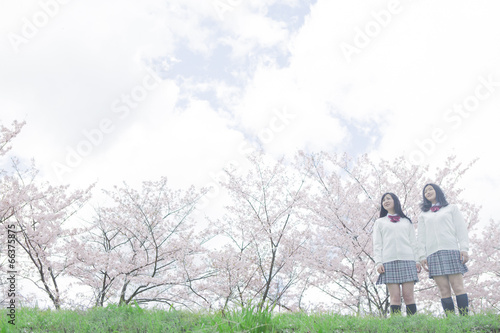 桜をバックに立つ高校生