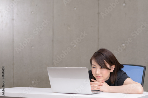 突っ伏してパソコンを見る女性
