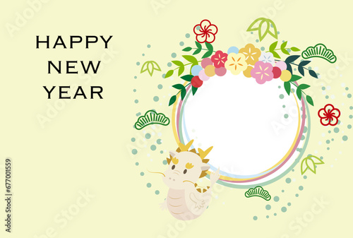 龍、松、竹、梅の花をあしらった花輪のフォトフレーム年賀状(賀詞あり)