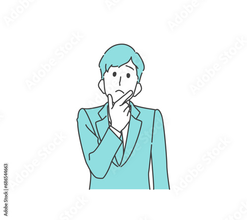 顎に手、首を傾げて悩む、考えるスーツの男性