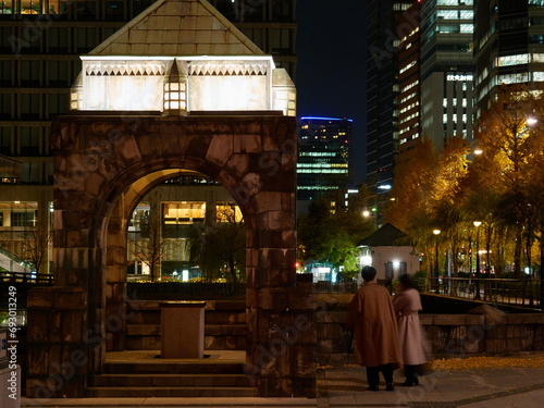 夜の皇居前の街並みの風景と男女の姿