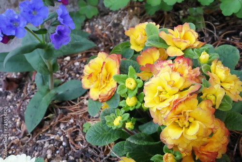 黄色いプリムラ(ベラリーナ)と青いプルモナリア(ブルーエンサイン)