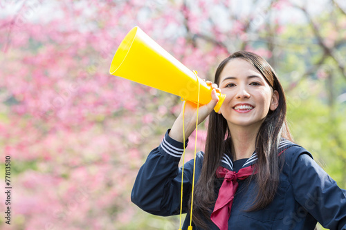 桜をバックにメガホンで応援をする女子学生