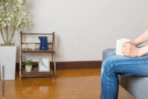 リビングルームで休憩するためにソファに座ってコーヒーを飲もうとする女性