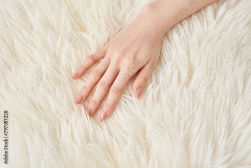 ふわふわした生地を触る女性の手元
