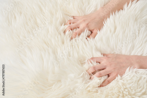 ふわふわした生地を触る女性の手元