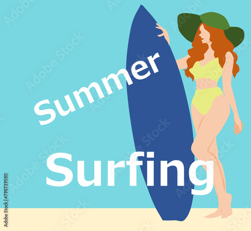 サーフボードを手に持つ女性のイラスト