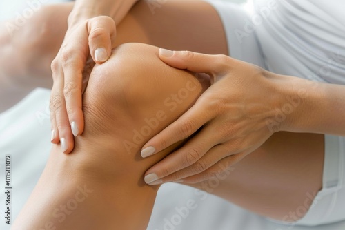 両手でひざを押さえる日本人女性(膝の痛み・ひざの痛み・関節痛・膝関節)