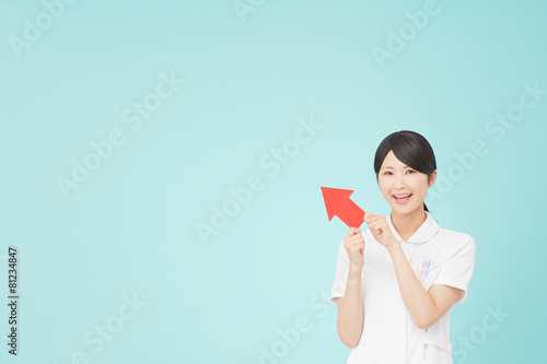 矢印で指す笑うナース