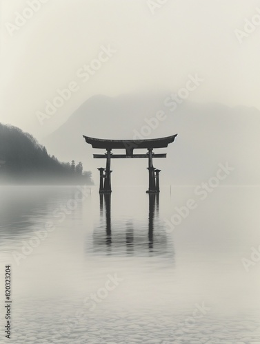 霧の湖に浮かぶ静かな鳥居、テキストスペース