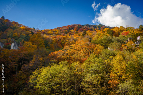 上高地へ向かう道から見える山の美しい紅葉(日本、長野県)