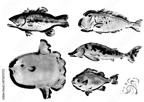 いろいろな手書きの魚の集合 和風筆書きの魚セット