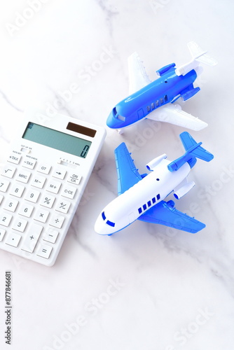 電卓と飛行機で、高騰する航空券代と、高騰する旅行代金のイメージ