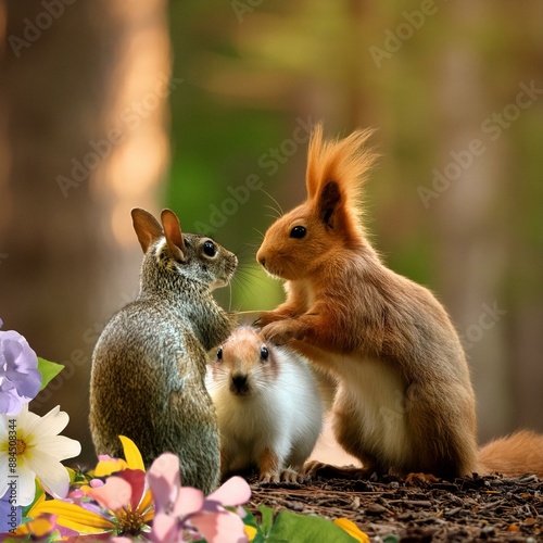 森の中で仲良く遊ぶウサギとリス、周りにはカラフルな花々