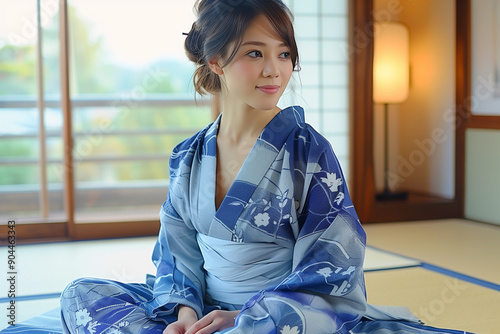 旅館の部屋で青い浴衣を着ている女性