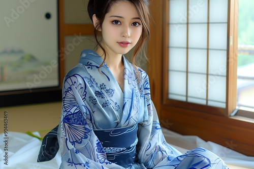 旅館の部屋で青い浴衣を着ている女性