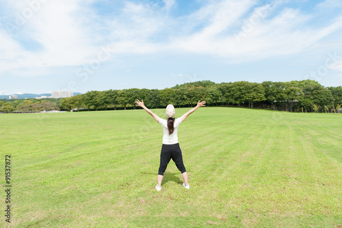 青空に向かって手を広げている女性の後ろ姿