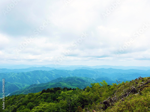 山頂から見る山並みと曇り空