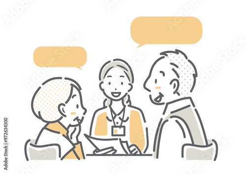 職員からアドバイスを受けるシニア夫婦 シンプルでお洒落な線画イラスト