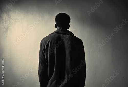 暗い部屋で壁を向いて立っている黒人男性の背中