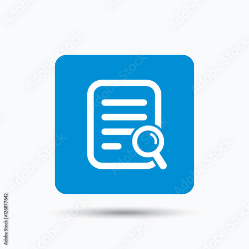 File search icon. Document page with magnifier tool symbol. Blue square button with flat web icon. Vector