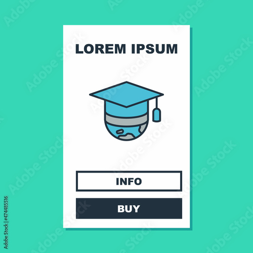 Filled outline Graduation cap on globe icon isolated on turquoise background. World education symbol. Online learning or e-learning concept. Vector