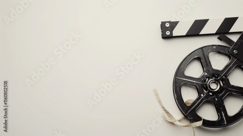 Film reel and clapboard on neutral background.