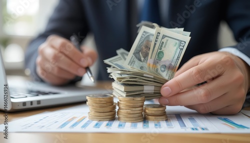 Financial Analyst Reviewing Charts with Stacked Coins and US Dol
