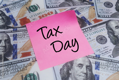 Financial concept for tax season with a pink Tax Day reminder note on a background of US hundred dollar bills